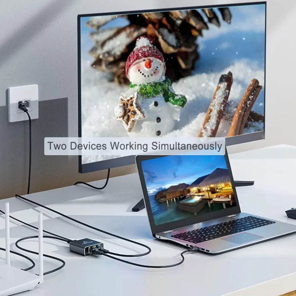 1. 1 to 2 Ports: This network cable splitter allows you to simultaneously connect your router or Ethernet switch to two different networks. The 1-to-2 output design of this Ethernet cable splitter is ideal for resolving connectivity issues caused by limited wiring. It serves as a simple yet efficient network distributor, helping you expand your network ports. It is powered by the included USB cable and supports sharing one Ethernet line between two computers.