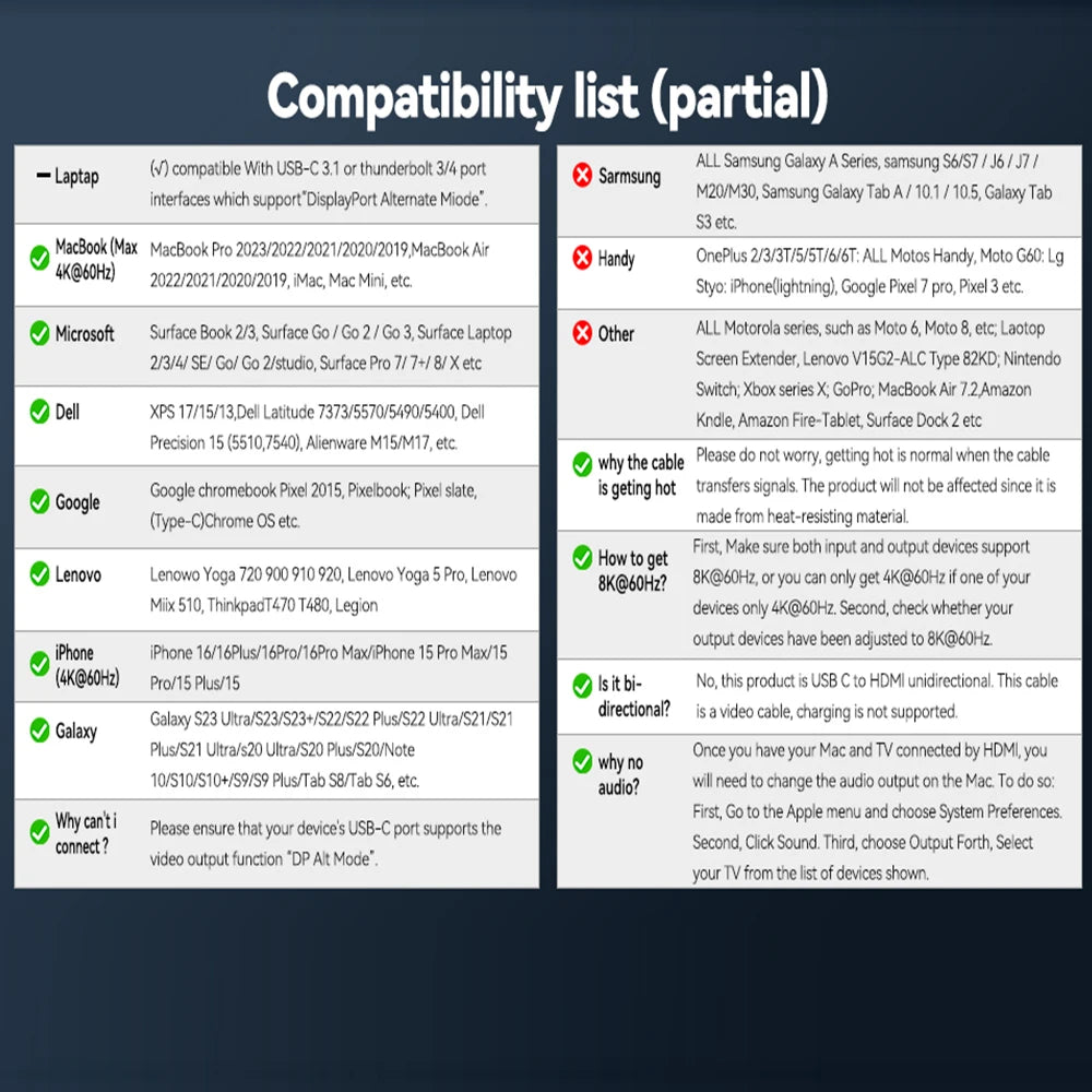【Wide Compatibility 】- USB-C to HDMI 2.1 cable adapter compatible with Thunderbolt 3 and Thunderbolt 4 port. compatible for MacBook Pro 15''/ 13'' 2016 2017 2018 2019 and newer, MacBook 2016 and newer, iPad Pro, Dell XPS 13/15, Mac Mini 2018, 2020, HP Spectre x360, Galaxy Note 10/Note 9 and Samsung Dex phone/laptop, ThinkPad X1, Google PixelBook2, ASUS T303au, HUAWEI MateBook E/X, Razerbook, Yoga 910/920, Surface Book 2, Surface Go. NOTE: Please make sure your USB-C host support DP Alt Mode.