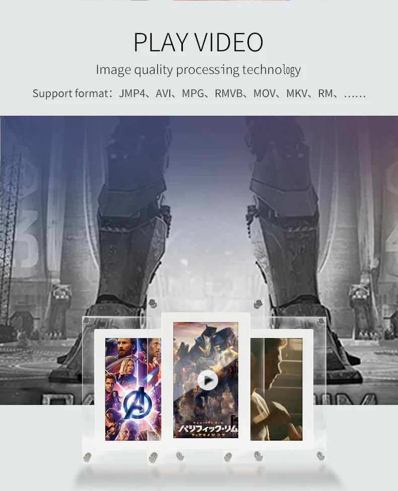 Our screen built in speaker, with internal 1GB memory for client to put their videos. So your video no more than 800MB will be ok to upload. And it will play in loop about 2-3hours after full charged.