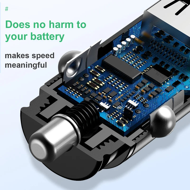 Dual QC3.0 Car Charger Output: 30w 4.5V/5A; 5V/4.5A; 9V/3A; 12V/2.5A; 5A Fast Charger