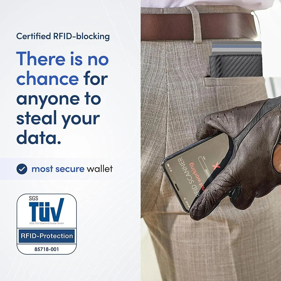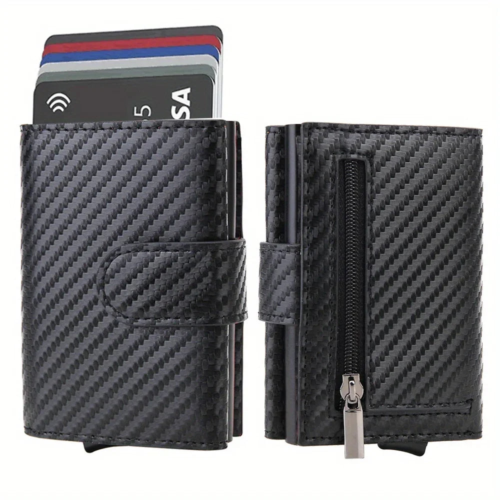Wallet Size 10*7.6*2.5cm(4*2.6*1 inch).In the wallet can hold 7-9 cards in total, there is an aluminum alloy card box., two independent card compartments and a banknote compartment. The card box consists of three layers of reflective aluminum foil. Can block high frequency signals such as rfid . You can place more important cards in the independent card slot or place some bills in the bill compartment. Cards and banknotes can be removed anytime! What a pleasant thing!