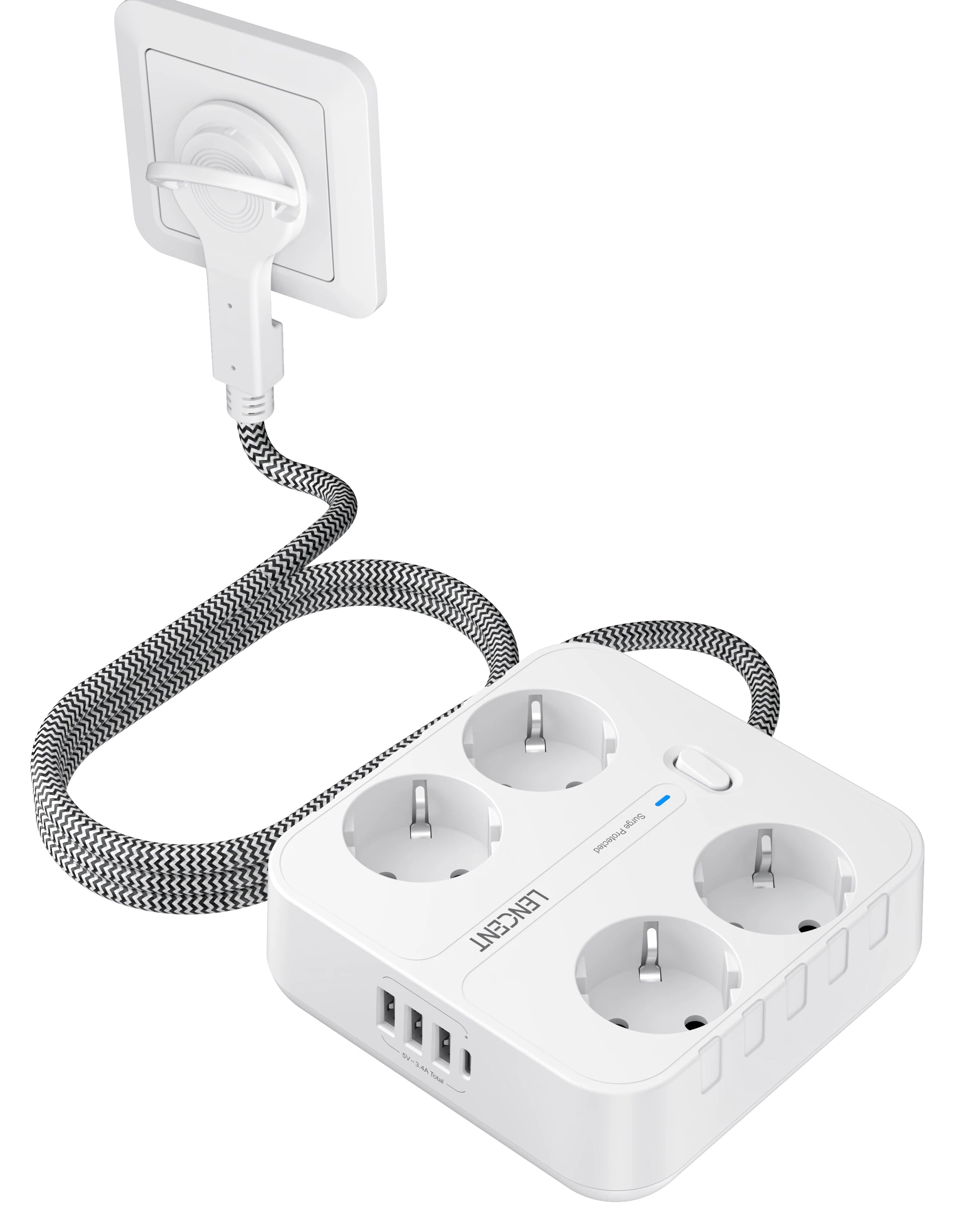 LENCENT EU Plug Power Strip with 4 AC Outlets+ 3 USB+ 1 Type C +2M/3M Braided Cable Multi Socket with Switch for Home/Office