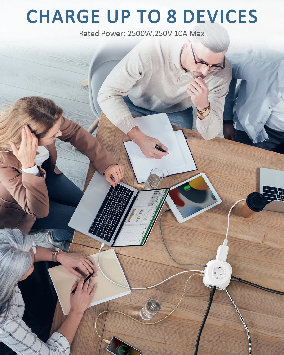 Unique plug socket design allows you to connect 4 large sockets, 3 USB ports and 1 Type-C port at the same time without hindering the use of neighboring sockets.