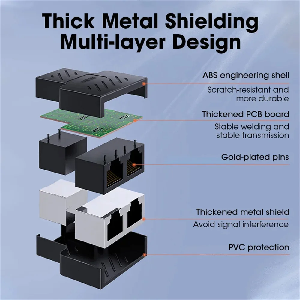 【SAFETY AND STABILITY】 - Environmental Protection and Flame Retardant ABS Plastic Shell, Fixed Rj45 Interface, 8 TVS Gas Discharge Tube Lightning Protection Technology, Shielding Electromagnetic Interference, Preventing Network Signal Loss or Damage. Rj45 Splitter Connector can also Safely Use the Network During Thunderstorms. Ethernet Cable Splitter Meets the Performance Requirements of Cat5 Cat5e Cat6 Cat7 Network Cables.