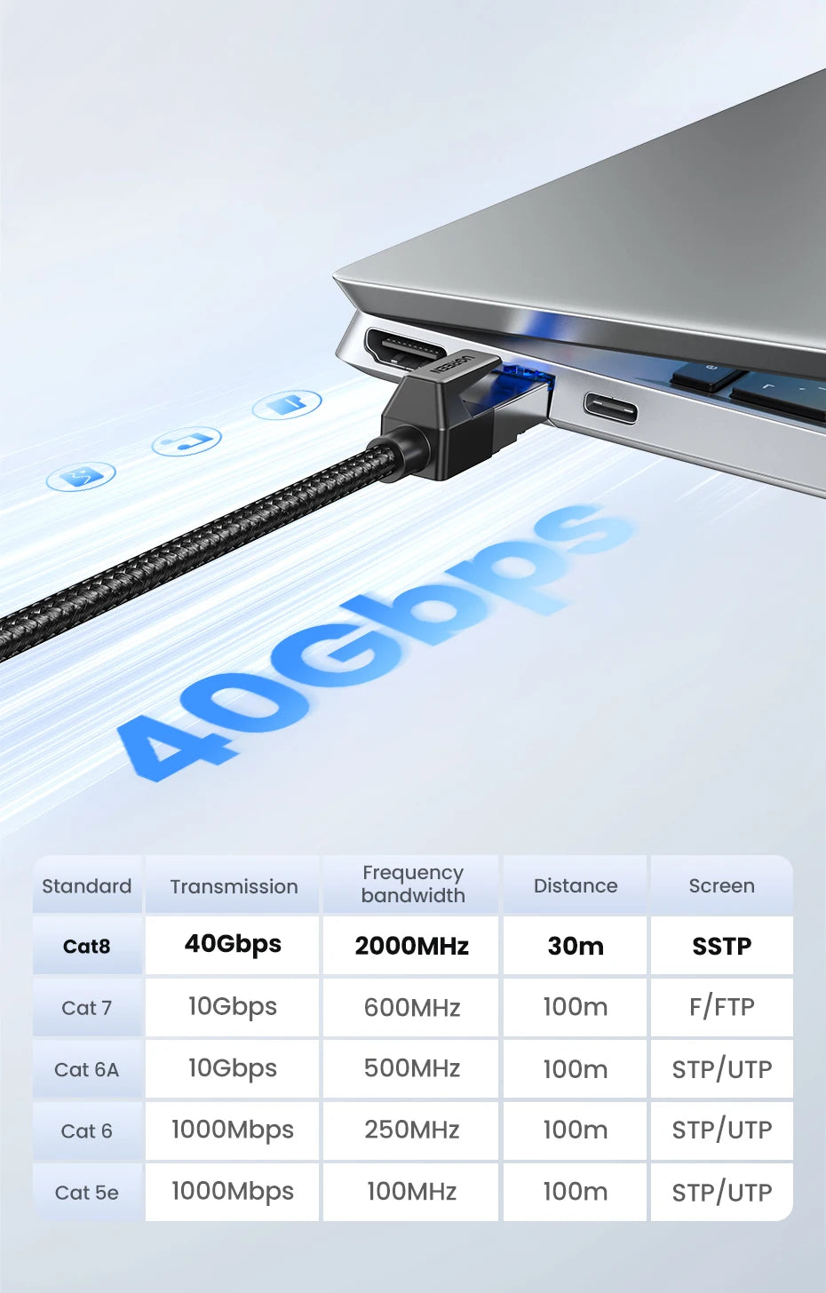 Cat 8 Ethernet Cable supports bandwidth up to 2000MHz and 40Gbps data transmission speed, ensuring stable network speed for you to online gaming, surf the Internet, online HD video streaming, upload, download, and more.