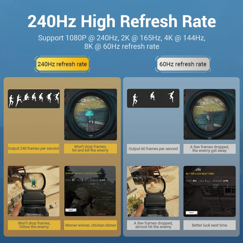 Support 1080P@240Hz,2K@165Hz,4K@144Hz,8K@60Hz refresh rate