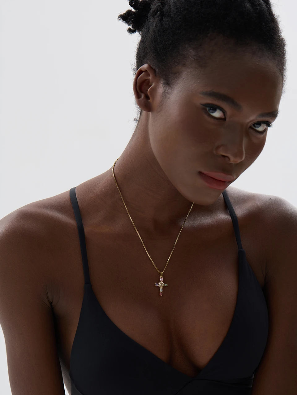 Yhpup Delicate Colorful Bling Cubic Zirconia Cross Pendant Stainless Steel Luxury Necklace High-Grade Fashion Shiny Jewelry Gift