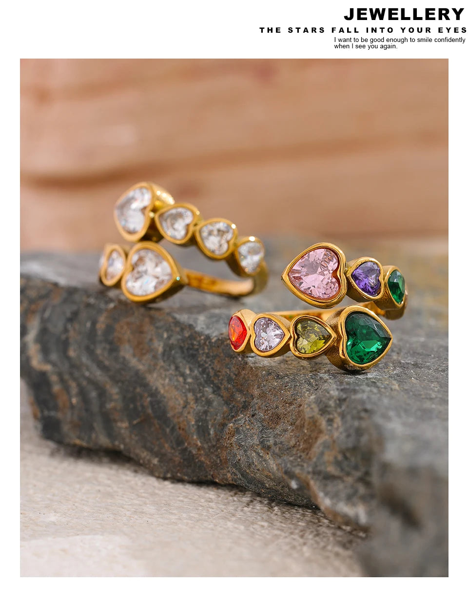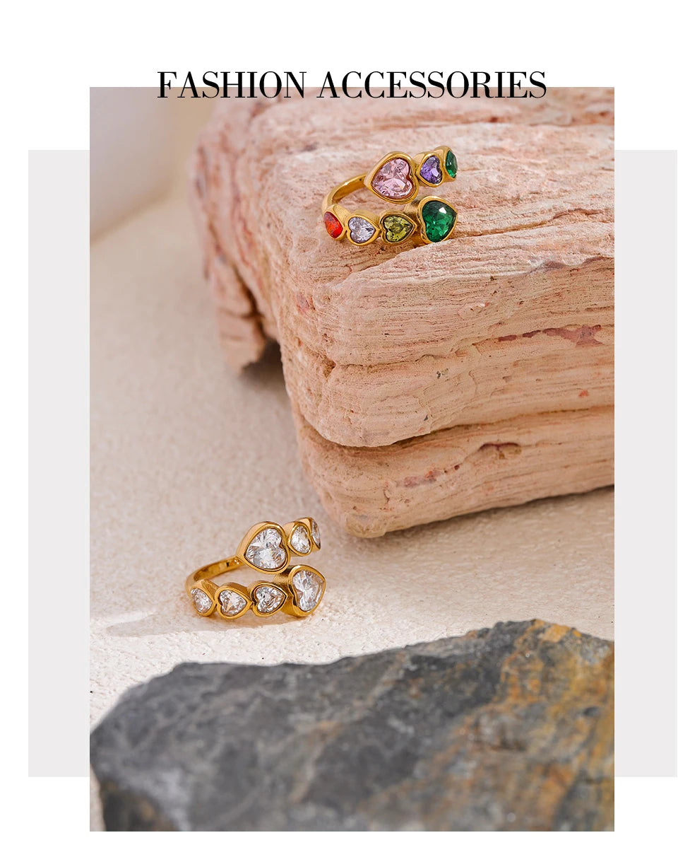 Yhpup Delicate Cubic Zirconia Heart Stainless Steel Gold Color Adjustable Fashion Open Ring High Quality Chic Charm Jewelry